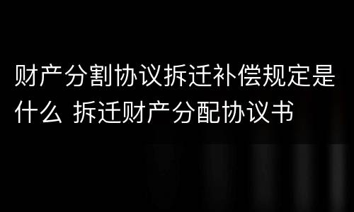 财产分割协议拆迁补偿规定是双方当事人可以关于财产分割的补偿协商来确定。具体关于财产分割方面的一些协议书的话,实际上是需要明确一下财产分割的一些具体的情况,并且关于补偿方面的问题作出明确的说明。