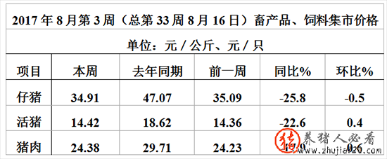 全国仔猪均匀价格34.91元/公斤,比前一周下降0.5%,同比下降25.8%。