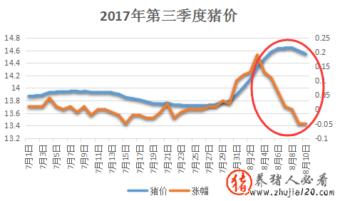 从上图我们可以看到外三元生猪价格从7月27日开始上涨后,临到近日逐渐的滞涨到达瓶颈并已经开始走下坡路,涨幅变幻处于快速的缩窄中。