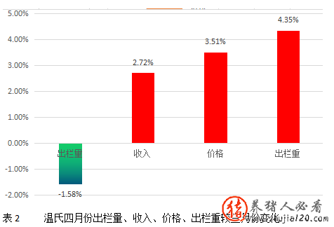 从表1、2很显然的我们可以看出温氏四月份在生猪出栏量减少的情况下,依赖上涨的猪价和生猪出栏均重的增添实现了收入的增长!