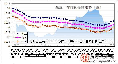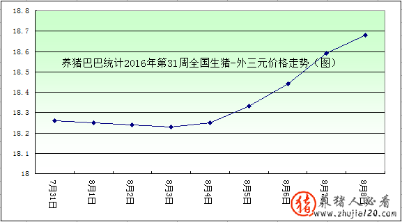 本周(2016年7月30日-8月5日)全国外三元猪价开始触底反弹,涨幅显然,周累积涨幅0.5元/公斤,部分省份周涨幅甚至在0.8-0.9元/公斤。全国各地本周生猪(外 三、内三、土杂)收购均匀价18.09-18.78元/公斤,与上周比上涨0.68元/公斤,相比价格上涨3.78%,结束了持续9周的下跌,比去年同期 下降了2.41%。统计的22个地区中,山西、河南、广西、北京、福建、湖南、天津、河北、甘肃、江苏地区的价格与上个统计周期相比小幅归落,其他地区的 生猪价格均有所上升。其中:江苏地区的生猪均匀价格跌幅最大,为4.58%;吉林地区生猪价格上涨幅度最大,为2.26%。辽宁地区生猪均匀价格最低,为 17.55元/kg;上海地区均匀价格最高,为19.16元/kg。本周生猪出栏量紧缩,猪价现微弱反弹之势。