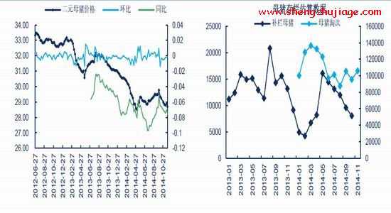 2014年11月,国内能繁母猪存栏跌破4400万头大关,环比降低1.2%,同比降低12.1%,至4368万头,为稀有据统计以来的最低点,且远低于农业部“4800万头”的预警线。