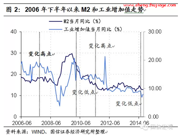 2010年4月至今,猪价正经历十年来的第三个猪周期,最低从2010年6月的14.86元/公斤上涨至2011年9月的30.41元/公斤,目前猪价回落至21.91元/千克。2011年9月猪价的阶段性高点,正好对应了工业增加值同比变化的高点(超过20%),而猪价在2014年上半年跌至谷底时,工业增加值和M2 当月同比变化增速均跌落至阶段性低点(图2)。