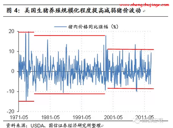 我们可以从美国的生猪规模化养殖进程中可以汲取经验。1960-1980年期间,美国生猪养殖业以小规模养殖为主;1980年代以后随着养殖技术的提高以及饲料工业的驱动,生猪养殖专业化程度迅猛发展,规模化进程快速推进,大型猪企充当了行业整合者,通过收购及推广“公司+农户”的模式迅速扩大市场份额。1987年,美国生猪存栏量超过1000头的猪场出栏量占比仅为37%,1992年上升至47%,1997年已达71%。1989-1999 年间下游包装肉行业集中度提升了22%,2009年生猪养殖行业前二十家养殖企业市场占有率超过70%。美国开始出现横跨饲料生产、生猪养殖、猪肉食品生产与销售的大型综合集团,生猪养殖效率显着上升,而全产业链的生产经营,也分散了产业链各环节的市场风险,抗周期能力明显增强。一个突出表现就是,美国猪价同比增速的波动区间日渐收窄(图4)。