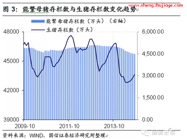 从生猪养殖流程来看,从能繁母猪补栏到形成商品猪的供应一般需要12-14个月,因此猪肉价格对能繁母猪存栏数往往有12-14个月的滞后反应期。2013年下半年开始,无论是能繁母猪存栏数还是生猪存栏数,都显示出了较为明显的下降趋势。总体来看,本轮猪周期猪价下跌持续时间够长,跌幅够深,养殖户养殖亏损时间够长,亏损够深。因此,本次下跌周期接近尾声之际,养殖户无论是对仔猪的补栏积极性还是对能繁母猪的补栏积极性都并不高。生猪存栏数虽从底部有所抬升,但仍处相对较低的位置,能繁母猪存栏数则持续下降(图3)。可见,本轮猪周期无论是从去库存还是从去产能角度来看,都清除得足够彻底。
