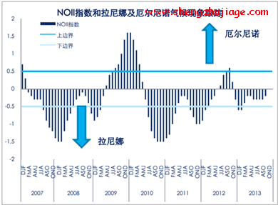 天气将是贯穿到2014年度,作用于豆类上游产量的最关键的变量。现实的情况是,今年到明年全球气候是一个较为正常的年份。NOII值在【-0.5,0.5】区间内变动,属于较为正常的值(如果一段时间内超出0.5,则趋向厄尔尼诺,如果持续跌出-0.5.则趋向拉尼娜)。通常,拉尼娜的表现是干旱,厄尔尼诺的表现是降水较多。但是,人类直到今天还是不能完全预测天气,尤其是农场大豆的种植从某种意义上说生产力的发展仍不能完全摆脱天气的困扰。在现实的对来年“风调雨顺”的预期下,得到较为乐观的全球产量的预估,如果后期一旦天气这个重要变量发生变化,可能的驱动方向就是产量环比下调,市场行情价阶段性向上炒作。而且,贯穿每一年的全球大豆生产过程中,总不可避免天气炒作这个经久不衰的话题。