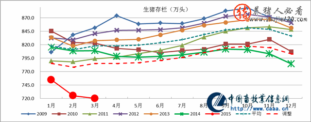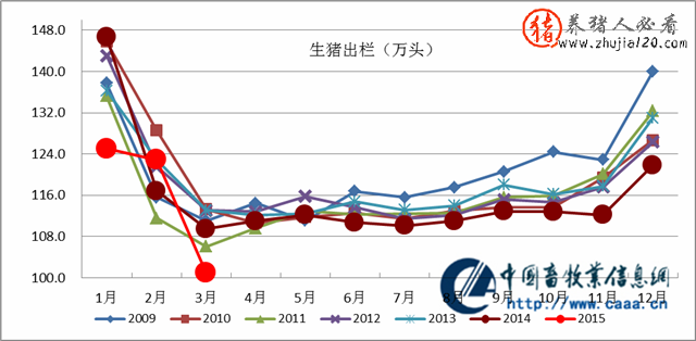 3、产能深度调整。2015年3月,生猪存栏同比下降10.68%;能繁母猪存栏同比下降15.31%。