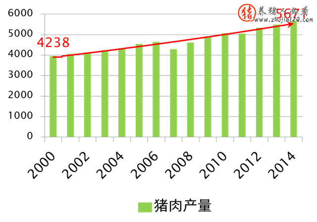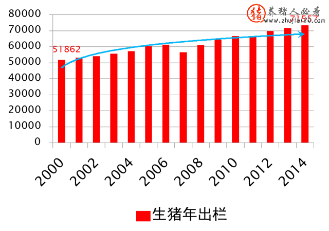 2000-2014年,生猪年出栏由51862万头增至73510万头,增长41.7%,年均增长2.5%。