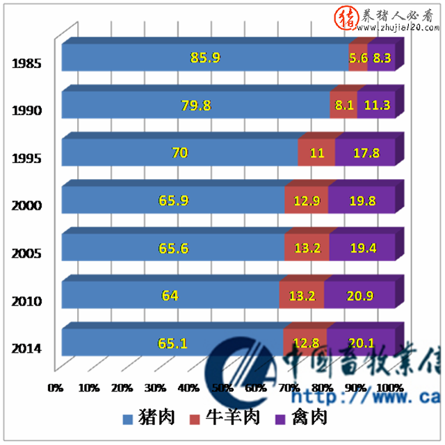 1985年—2000年,猪肉大幅下降,降低20个百分点;禽肉明显增加,提高11个百分点;牛羊肉小幅增长,增加7个百分点。