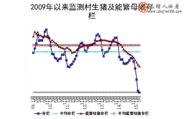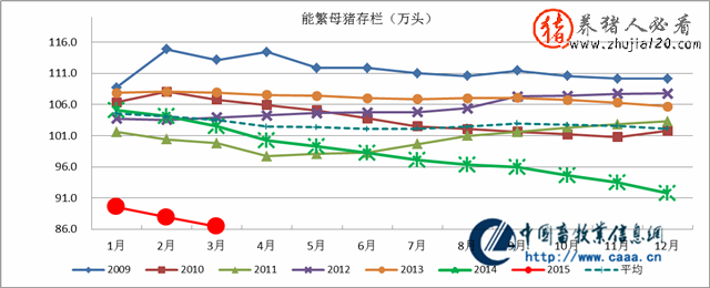 2015年3月,能繁母猪存栏86.43万头,同比大幅减少15.31%,环比减少1.66%。能繁母猪存栏较最近一个周期内各年度同期平均水平低16.52%,从2008年以来历史数据看,生猪产能已降至相对较低水平。