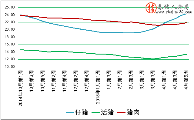 4、3月底以来小幅回升。4月第5周,活猪和猪肉价格分别为每公斤13.40和21.85元,同比分别上涨22.2%和12.9%。