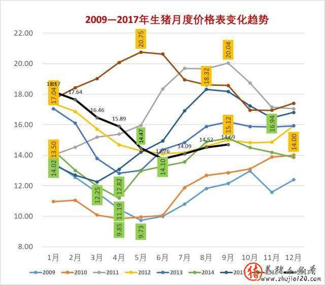 从生猪价格年度变幻曲线可以看出,2017年的生猪价格变幻曲线与2012年的生猪价格走势相如,2017年仅剩4个月后,最后几个月是否还会发展出相如的趋势,让我每淳空多出几分猜想……