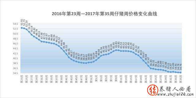 2017年第35周仔猪价格每千克34.76元,潞傍低幅度下跌,与2016年第23周相比,下跌幅度已达34.3%,超过生猪价格跌幅4.1%,反应市场对未来生猪价格预期冷漠。