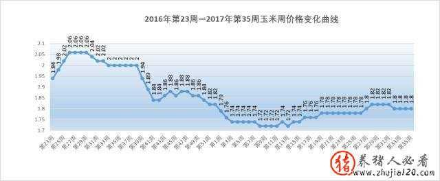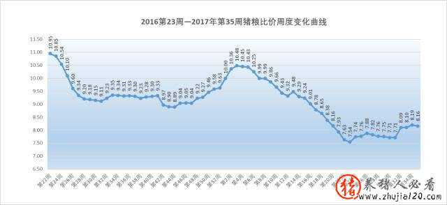 2017年第35周玉米价格每千克1.8元,持续4周稳定。猪粮比价受生猪价格微跌影响,略有下降,反映为8.16,养殖利润依然能有保障。