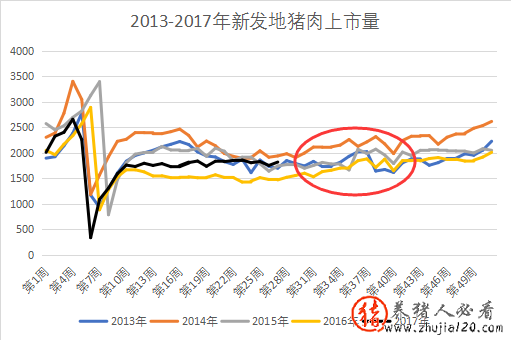 从上表画圈的部分我们可以看到图中2013-2016的4个年份8月生猪消费需求都有显然的好转,而且8月之后到春节前的集体消费需求都是增添的,属于消费旺季。因此我们可以认定今年也不会例外,往后的日子消费需求只约摸越来越好。