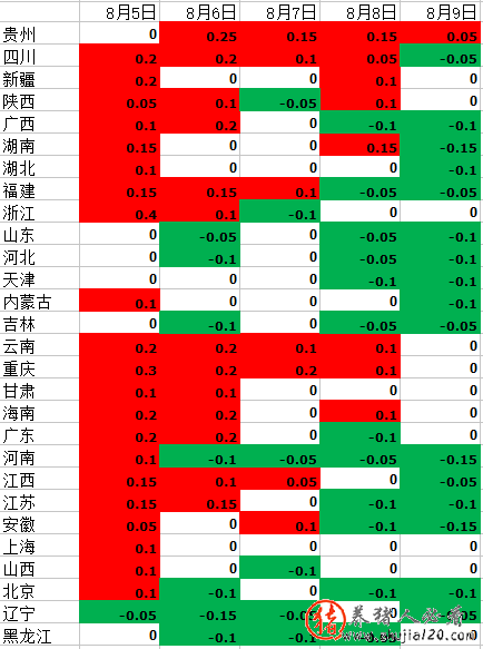 从上表可以看到从8月5日开始至8月9日的地区涨跌日变幻,我们可以发明这次下跌是一个循序渐进的过程,最初是东北、接追署渐蔓延到北方地区,然后是南方地区,最终波及到全国。