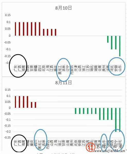 图2 8月11日、11日全国不同省份猪价涨跌情况