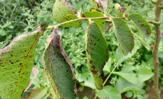 叶片受害先在叶脉间出现褐斑,有水浸状圈,严重时病斑连片整个叶片变黑脱落。属细菌性病害。浸染主要靠风雨昆虫传播,在花期可随花粉传播。浸染期在核桃树展叶期和花期,花期前后降雨多空气湿度大有利于该病的发生。雨后病害迅速蔓延。密度大,通风透光不良发病就重,反之轻。