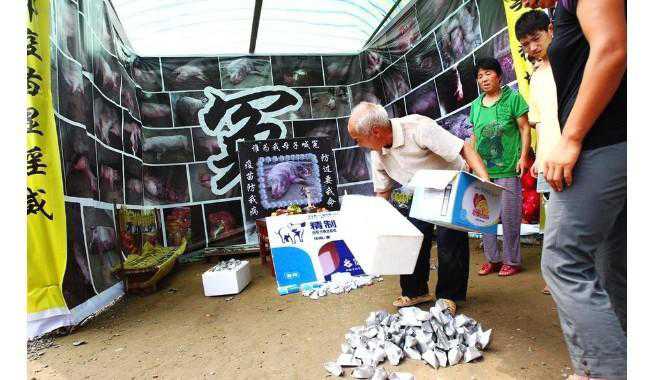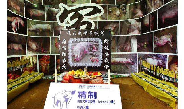 在一个养猪场的门前赫然搭建了一个祭奠亡猪的灵棚,灵棚四周则用黑色调印满了纪念死亡猪的照片